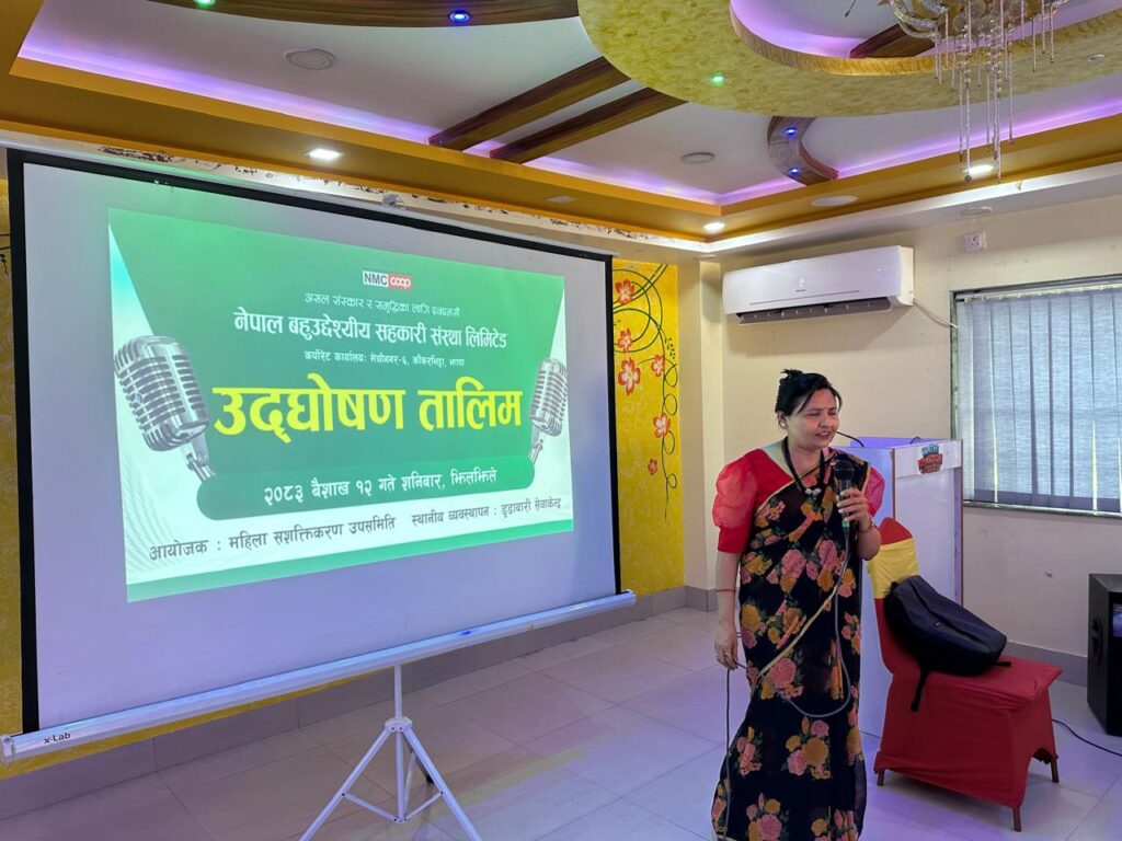नेपाल बहुउद्देश्यीय सहकारी संस्था लिमिटेडको विषयगत उपसमिति अन्तर्गत महिला सशक्तिकरण उपसमितिको आयोजनामा एकदिवसीय उद्घोषण तालिम सफलतापूर्वक सम्पन्न भएको छ । कार्यक्रम उपसमितिकी संयोजक पवित्रा न्यौपानेको अध्यक्षतामा सम्पन्न भएको हो ।उक्त कार्यक्रममा संस्थाकी वरिष्ठ उपाध्यक्ष भगवती घिमिरे मैनाली, लेखा सुपरीवेक्षण समितिकी संयोजक रचना दाहालको प्रस्तुति रहेको थियो । भगवती घिमिरेले संस्थाका सदस्य सहजकर्ताहरुलाई उद्घोषण सम्बन्धी व्यवहारिक […]